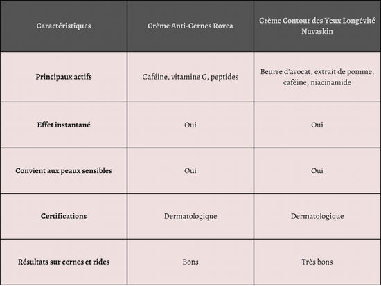 La crème Rovea semble donc plus adaptée aux personnes souhaitant des bénéfices rapides sur le contour de l'œil, et prêtes à investir un peu plus.